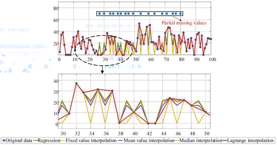 To evaluate the driving behavior, the vehicle velocity, velocity standard deviation, acceleration, acceleration standard deviation, acceleration rate of change, gas pedal travel, and brake pedal travel are initially selected as the characteristic factors to be evaluated. The selected data are pre-processed by adding and removing missing data appropriately, cleaning the data to remove noise, and deleting the useless data to mitigate redundancy. First, to maintain the variation pattern of the original data to the maximum extent possible, we compared the data processing effects of regression method, fixed value, mean, median interpolation method, and Lagrange interpolation method, as shown in Figure 2. The Lagrange interpolation method supplemented the missing data and most closely approximated the fluctuation of the original data. The Lagrange interpolation method with the best effect is used for missing data, and its calculation formula is as follows: