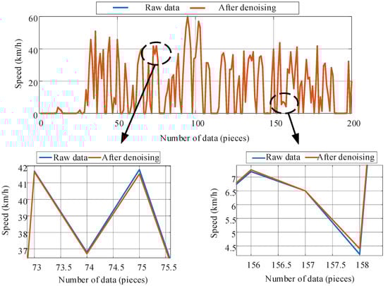 Then, a wavelet denoising method is leveraged to clean the data and extract the main part of the signal with higher fidelity, as shown in Equation (2). A comparison of data completion and before and after denoising is shown in Figure 3 where the data fluctuation with large noise has been significantly improved.