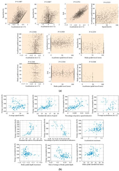 In order to make a comprehensive evaluation of driving behavior, the safety and economic evaluation indexes were first extracted. A Pearson correlation analysis and R2 test were completed based on the speed, standard deviation of the speed, standard deviation of acceleration, jerk, accelerator pedal stroke, and brake pedal stroke, as shown in Equations (3) and (4). After the correlation test, as shown in Figure 4a, the most obvious information is that there is a high correlation between the speed and acceleration, a positive correlation between the acceleration and accelerator pedal stroke, a negative correlation between the accelerator pedal stroke and brake pedal stroke, and a negative correlation between the accelerator pedal stroke and brake pedal stroke. As can be seen from Figure 4b, the highest correlations are found between the standard deviation of the velocity, the percentage of positive velocity (v > 60 km/h), and the mean and standard deviation of acceleration and energy consumption. Therefore, the jerk is excluded and the acceleration can represent both the acceleration and braking characteristics, so removing acceleration pedal stroke and brake pedal stroke can greatly improve the calculation efficiency and remove the redundant characteristic factors.