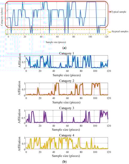 First, the fuzzy C-Means (FCM) algorithm is used to cluster the sample data. The sample size of the electric bus dataset is only 10, which cannot be trained to obtain reasonable results. Therefore, in this study, the monthly data of each vehicle was used as a sample, with a total of 120 samples. Each month, 90% of the data are randomly selected as training samples and 10% as test samples. Typical training samples are extracted using the FCM algorithm, as shown in Equation (5). After FCM clustering, as shown in Table 1, the data are divided into different categories, and four categories of cluster centers are distinguished, and the four cluster centers show significant differences in the values of the four indicators. Further, we extract the typical samples in the dataset, as shown in Figure 5a, where the number of categories “1, 2, 3, 4” represents the 4 types of typical samples, and the number of categories “0” represents the filtered atypical samples. The affiliation of the 4 categories is shown in Figure 5b, From the intercepted sample fragments, it can be seen that the membership degrees of the four types of samples are quite different.