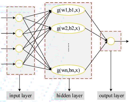 ELM is a feed-forward neural network algorithm with one-time tuning of all the parameters without iterations, which has high learning efficiency and strong generalization ability. The algorithm randomly selects the weight of the input layer and the bias of the hidden layer, and finally directly calculates the weight of the output layer by the least square method. The ELM-based evaluation model that was constructed in this study is shown in Figure 6. The input layer has 4 nodes with 4 feature indicators, and the hidden layer has 50 nodes. Among them, the activation function is , and the node is 1, which represents the number of categories.