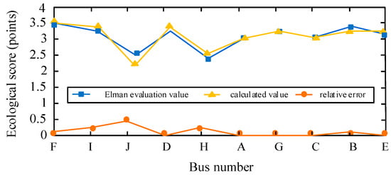 The results of the economic evaluation model are analyzed, as shown in Figure 8, and it is found that the Elman-based economic evaluation score is close to the reference score, and the relative error is also small. The accuracy of the evaluation results is then analyzed by calculating the root mean square error (RMSE), as shown in Equation (9). The RMSE of the Elman neural network-based evaluation result is 0.1329, indicating that the mean error of the buses’ economic evaluation result is small.