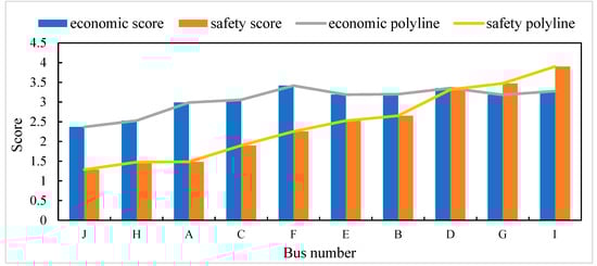 After evaluating the economy of the bus driving behavior, the bus safety score and the economy score are determined simultaneously. The economic score of the bus A to J bus that was based on the Elman neural network was analyzed in the order from highest to lowest safety level that was obtained based on the ELM evaluation model. As shown in Figure 9, it can be found that the bus drivers with higher safety scores also tend to have relatively higher economy, and the change trend of safety score and economy score is generally consistent, indicating that there is a correlation between safety and the economy of driving behavior to a certain extent.