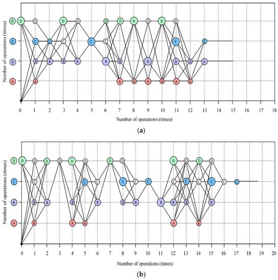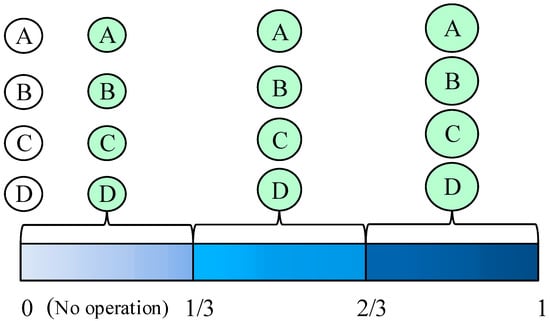 Definition of driving action behavior nodes (the letter in the circle represents the type of driving action, A indicates the acceleration, B indicates the speed, C indicates the acceleration pedal travel, and D indicates the brake pedal travel; the size of the circle represents the degree of driving action, the larger the circle, the more intense the driving action).