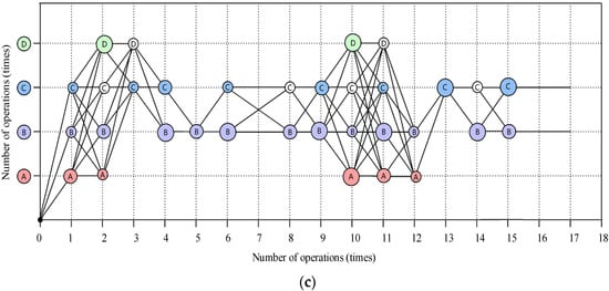 Driving behavioral mapping analysis of (a) the safest bus, (b) the most economical bus, and (c) the least safe and economical bus. (A indicates the acceleration, B indicates the speed, C indicates the acceleration pedal travel, and D indicates the brake pedal travel).