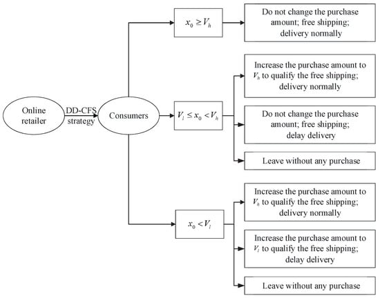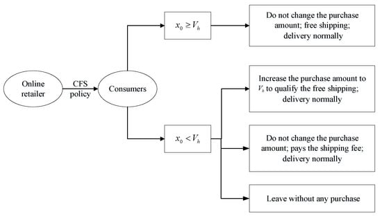 Shipping-fee-sensitive consumers are more shipping-fee-sensitive but less delivery-time-sensitive. Their purchasing behaviors are affected by the high and low CFS threshold values. The shipping-fee-sensitive consumer’s purchasing decision is analyzed in the following three cases, as shown in Figure 3.