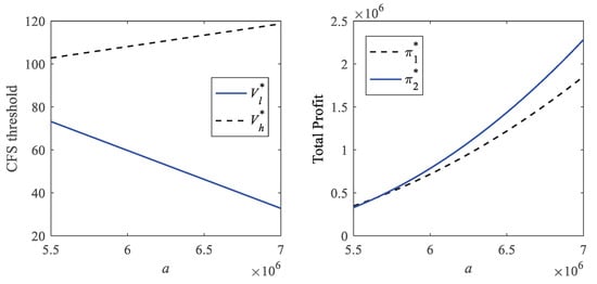 As can be observed from Table 2, compared to the basic model, the market demand for the developed model with the delayed delivery increases by 138.65%, and the online retailer’s profit increases by 9.36%. Thus, it is profitable for the online retailer to implement the DD-CFS policy. Figure 7 shows the impact of the potential market size a on the online retailer’s CFS threshold values and profit. As we can see, as potential market size a increases, the high CFS threshold will increase, the low CFS threshold will decrease, and the total profits ( and ) will increase. This suggests that when the potential market size is very large, the online retailer should set a larger high CFS threshold and a smaller low CFS threshold to earn more profits. Setting a larger high CFS threshold aims to induce consumers to increase their purchase amounts to qualify for free shipping. This result can be observed in an online bookstore in China. The bookstore increased the high CFS threshold value from CNY 39 in 2011 to CNY 49 in 2016 (Song et al. [18]). At the same time, setting a smaller low CFS threshold aims to attract more consumers to choose the delayed delivery, which can reduce order processing expenses. In addition, we can also see from Figure 7 that when the potential market size is not very large, the total profit of the basic model is larger than the total profit of the developed model with the delayed delivery (). When the potential market size is enormous, the total profit of the developed model with the delayed delivery is larger than the total profit of the basic model (). Moreover, as the potential market size a increases, the increased profit () increases. This illustrates that the online retailer should apply the traditional CFS policy during the ordinary sales period. During the large-scale promotions period, the online retailer should apply the DD-CFS policy with two threshold values.