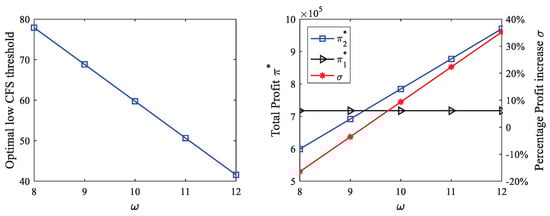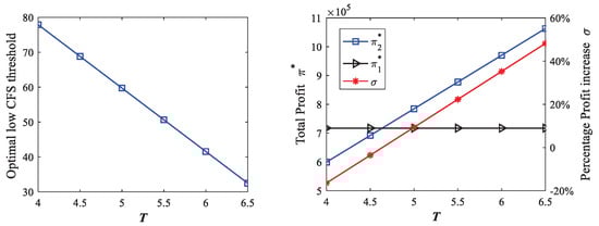 We begin by examining the effect of the length of the delayed delivery time T on the online retailer’s optimal CFS threshold, profit, and the value of the delayed delivery. In this sensitivity analysis, we increase the value of T from 4 to 6.5 in increments of 0.5 and compute the optimal CFS threshold values, profit, and the percentage profit increase for each value of T. We find from Figure 8 that as the length of the delayed delivery time T increases, the low CFS threshold value () will decrease, whereas the profit of the developed model () and the percentage of the increase in profit () will increase. As T increases, the negative utility brought about by the delayed delivery increases, consumers are more reluctant to choose delayed delivery, and some consumers may abandon their shopping carts. Thus, the online retailer should accordingly reduce the low CFS threshold value to induce more consumers to choose delayed delivery. In addition, since the market demand is negatively correlated with the CFS threshold value, the market demand will increase with the decrease in the low CFS threshold. Hence, profits in the developed model will increase with increases in T. The longer the delayed delivery time, the more value the online retailer can obtain from the delayed delivery.