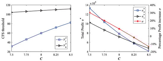 We investigated how changing the shipping fee C impacts the online retailer’s optimal CFS threshold, profit, and the value of the delayed delivery. For the sensitivity analysis, the value of C was increased from 7.5 to 8.5 in increments of 0.25. As can be seen from Figure 9, as C increases, the high CFS threshold () and low CFS threshold () will increase. As the shipping fee increases, the online retailer should accordingly raise the CFS threshold values to reduce its shipping-related expenses, which may prevent some consumers from buying online. This result can also be observed in Yihaodian, an online supermarket in China. The shipping cost of fresh products is higher than that of ordinary products. China’s Yihaodian offered consumers free shipping for every order of ordinary products over CNY 68 and every order of fresh products over CNY 99 in 2016. In addition, with the increase in C, the profit of the basic model () and the profit of the developed model () will decrease. This implies that increasing the shipping fee always inevitably harms the performance of an online retailer which cannot change its decisions to eliminate negative impacts. This result is supported by Leng and Becerril-Arreola’s study [15].