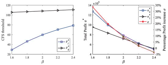 For this sensitivity analysis, we increased the value of from 1.6 to 2.4 in steps of 0.2. As shown in Figure 11, we found that increasing the value of forces the online retailer to increase its optimal high and low CFS thresholds. This occurs because of the following reason. As the value of increases, consumers are more reluctant to pay the shipping fee. Under the traditional CFS policy, more consumers will choose to increase their purchase amount to qualify for free shipping, which gives the online retailer very high shipping expenses. Under the DD-CFS policy, with the increase in , the proportion of shipping-fee-sensitive consumers will increase, and the proportion of shipping-fee-sensitive consumers who choose to increase the purchase amount and opt for the delayed delivery to qualify for free shipping will increase. This also means that the online retailer has to pay more shipping fees. Thus, the online retailer should increase the high and low CFS threshold values to stimulate consumers to increase their purchase amounts to compensate for high shipping expenses.