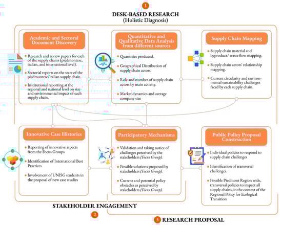 - Participatory mechanisms: while a better understanding of each supply chain was established by mapping and quantifying their dimension, complexity, and economic relevance at a regional level, the next step of the project was designed to include the personal experience of several actors from each supply chain, as well as their interaction with institutional representatives. This phase was conducted, in line with the scientific literature analyzed, on the topic of the circular economy, which revealed the need to involve stakeholders at the level of the supply chain in the development and evaluation of possible directions for the transition from a linear to a circular and more sustainable system, in order to understand potential, dormant assets and possible barriers [13]. The process followed therefore placed emphasis on the engagement of relevant stakeholders for contemporary agri-food circular economy research. Taking the project’s final objective of public policy development into account, it was decided that it was best to employ a participatory, deliberative approach to the validation of the quantitative analysis, as well as to the understanding of challenges faced by each of the supply chains. Therefore, a series of supply chain circularity and ecological transition-focused focus groups were designed and implemented.