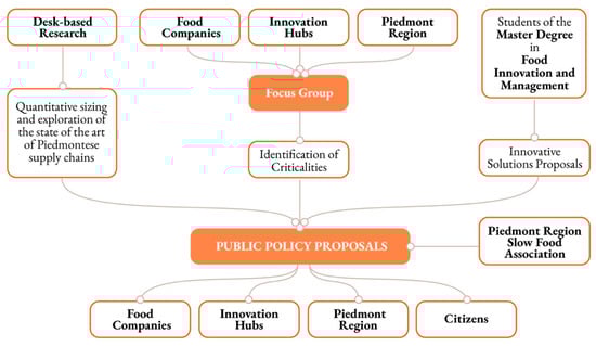 - Academic and sectoral document discovery: as a primary step, and to better define the extent of each supply chain, relevant research papers and sectoral documents were researched. Using the keywords “waste”, “byproduct”, “waste management” and “circular economy”, followed by each of the individual supply chain names, in an academic search engine (Google Scholar) and in a scientific article database (Scopus), with a total number of 75 selected articles, ranging from scientific articles reporting on similar initiatives on a smaller or similar scale, to sectoral documents, used to better delineate the size and boundaries of each supply chain. In addition to supply chain structure and boundaries, the documents were also analyzed for information regarding the current practices of waste or by-product disposal, valorization and/or and treatment, as well as for the private and public sectors’ interests and understanding of the challenges currently present in the Piedmontese regional context. This step, using other terms, could also be called a literature review because it was performed to understand the scenario of the research proposal better and to analyze—at a micro level—the research gap identified. In fact, it consists of a thorough study review process of papers about the circular economy, food waste management, sustainable food supply chains, and local agri-food system. All the considerations developed during this phase have been inserted in the aforementioned text, in particular, in Section 1, Section 3 and Section 4.