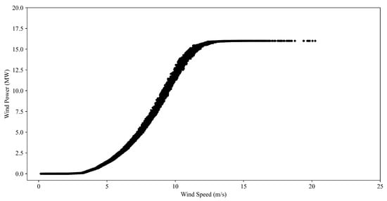 The historical wind power data of a complete year for the prototype wind farm are obtained by recording the wind power every 1 h. Since the wind turbines are generally located in an open-air field and work in a chaotic environment, the historical wind power data are easily disturbed by weather conditions. As a consequence, abnormal data will be inevitably recorded in the initial historical wind power. Accordingly, one will first eliminate the abnormal data from the raw historical wind power data before the forecasting. In this regard, a wealth of methods is readily available [22,23,24,25,26,27,28,29]. However, the approach as introduced in [30] is used in this study. The finally used v-p wind power curve is given in Figure 1. In the implementation of a wind power forecasting methodology, the first 70% of the total data are used as the training data, and the remaining 30% as the testing data. The target of the training data will be expanded 1.2 times into the upper training data, and reduced 0.8 times into the lower training data, respectively. The initialization of the output weights (the decision variables) of the upper bound and the low bound is conducted in the two training datasets via KELM. One will then set a neighborhood (or variation) range for each output weight by adding 2 and subtracting 2 from the initial weights to construct the ranges of weights. The domain of the optimization function is then determined. The confidence level of intervals is set to be 100(1−0.1)%.