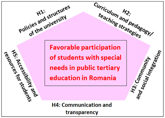 Thus, the factors that can contribute to ensuring an inclusive education system cover a range of dimensions that are further conceptualized and translated into operational hypotheses (the dependent variable for all is the participation of students with special needs in public tertiary education in Romania):