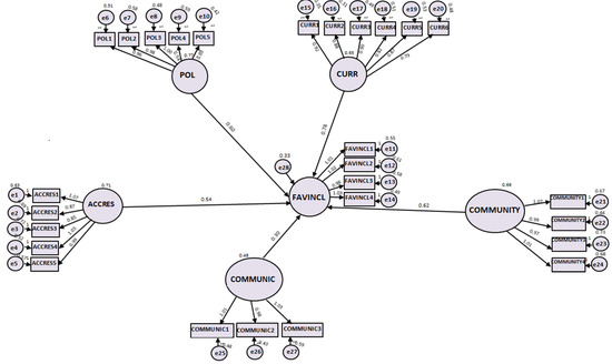 Commonly, the literature related to statistics and econometrics recognizes that standardized path coefficients (β) estimated below 0.10 would signify a “minor” impact, the ones close to 0.30 denote a “medium” impact, and the ones above 0.50 signal a “major” impact and the consistency of the relationship between the variables and therefore of the respective hypothesis [59]. Keeping this general theoretical rule in mind, it could be stated that the path coefficients of the “policies and structures of the university” H1 (β = 0.603, p < 0.01) validated that covering ideas of inclusive participation of students with special needs within the university strategy and policies positively and significantly, with a major effect, influences the willingness and openness for inclusive education for Romanian universities. Subsequently, H1 was accepted. Uniform with the first hypothesis, the path coefficients for “curriculum and pedagogy/teaching strategies” H2 (β = 0.774, p < 0.01), “community and social integration” H3 (β = 0.616, p < 0.01), and “accessibility and resources for students” H5 (β = 0.539, p < 0.01) showed that these three constructs also influence positively and majorly the willingness and openness for inclusive education for Romanian universities.