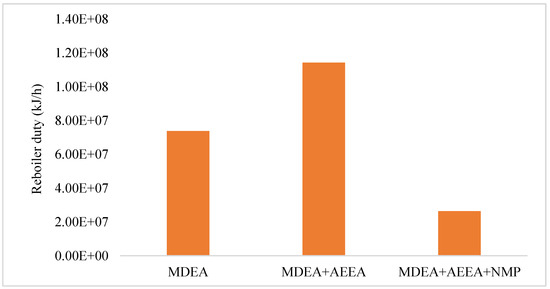 The reboiler duty with solvents composition at MDEA (40 wt.%), MDEA (30 wt.%) + AEEA = (10 wt.%), MDEA (15 wt.%) + AEEA (5 wt.%) + NMP (20 wt.%).
