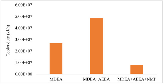 The comparison of cooler duties at MDEA (40 wt.%), MDEA (30 wt.%) + AEEA = (10 wt.%), MDEA (15 wt.%) + AEEA (5 wt.%) + NMP (20 wt.%).