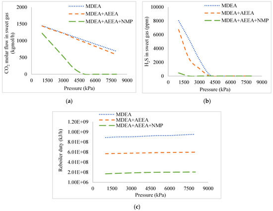 The results of increasing absorber pressure at MDEA (40 wt.%), MDEA (30 wt.%) + AEEA = (10 wt.%), MDEA (15 wt.%) + AEEA (5 wt.%) + NMP (20 wt.%) of (a) CO2 in sweet gas (b) H2S in the sweet gas (c) the reboiler duty.