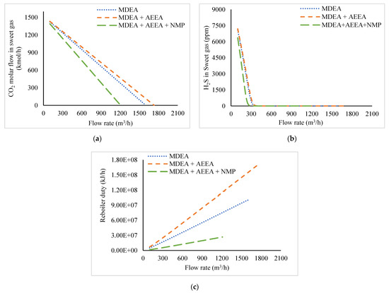 The results of increased solvent flow rate at MDEA (40 wt.%), MDEA (30 wt.%) + AEEA = (10 wt.%), MDEA (15 wt.%) + AEEA (5 wt.%) + NMP (20 wt.%) on the (a) CO2 in sweet gas (b) H2S in sweet gas (c) reboiler duty.