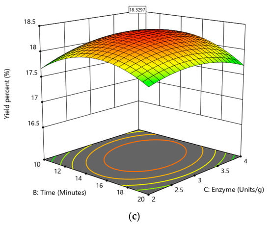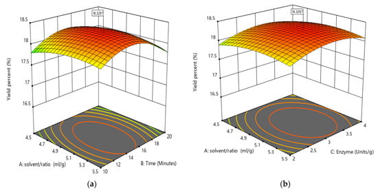 The effect of the solvent sample ratio and time at a fixed enzyme unit of 3.314 on sea buckthorn percent oil yield is presented as a 3D surface plot (Figure 1a), which indicated that sea buckthorn oil yield percentage increased with an increase in the solvent ratio. Furthermore, percent oil yield is increased when time is increased from 10 to 14.6, after this range a slight decrease in oil yield was observed. This can be explained by the phenomenon that the cell wall of the seed is completely ruptured and the impurities (insoluble substances, suspended lipids, and cytosol) become suspended in the solvent, which results in lower permeability of the solvent [,] and also re-absorption of oil, due to an increase in surface area of the cell wall [].