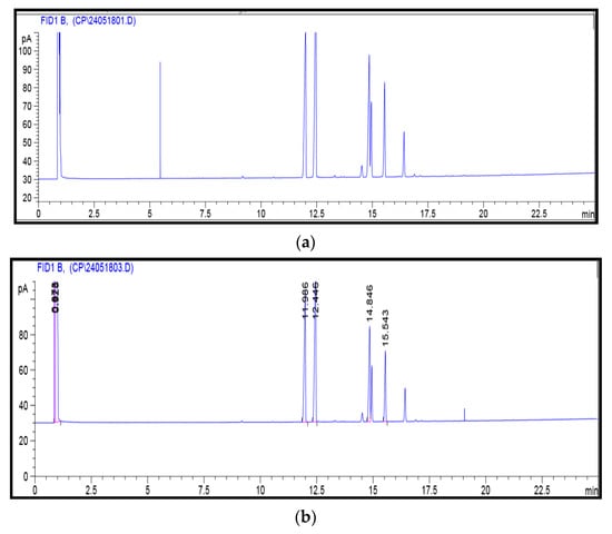 Chromatogram of sea buckthorn oil extracted by (a) the Soxhlet method and (b) ultrasonication-assisted enzyme extraction.