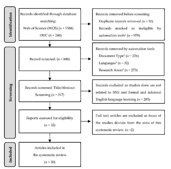 Malaysia being ranked eighth within the Asia and Pacific region for its Network Readiness Index (NRI) [11] makes it viable to revolutionize the current education system through the integration of SNS in English language learning. In fact, global researchers have already begun laying the foundation for this upcoming change through persistent research. Based on current findings, SNS undoubtedly aided English language learners to be positively affected in their language acquisition, motivation, confidence, and interest to engage in learning either formally or informally [8,10,12,13,14]. It has now become vital to ensure that SNS in English language learning could be sustained for generations to come in accordance with the Sustainable Development Goal 4 (SDG 4) [15]. Hence, this systematic review is aimed at interpreting recent verdicts regarding the integration of SNS in English language learning to unearth the answers to the research questions as follows: