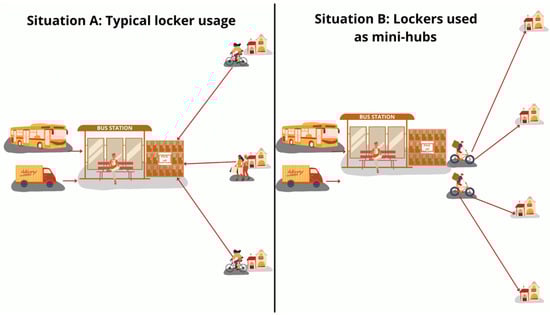 Usually, lockers are used, as described in situation A (Figure 1), where the consumer has an active role in the delivery, as s/he picks up the goods in the lockers. Consumers can reach lockers in public transportation stations by bus, walking or riding a bike. These lockers are supplied by vehicles, preferably electric vehicles, to encourage sustainable transport. Additionally, lockers can also be mini hubs, as illustrated in situation B. In this case, the goods are transferred from distribution centres to lockers. From this point on, goods are delivered to their destinations by crowdshipping systems, e.g., using bicycles. Thus, locker networks in PT stations can be used by consumers and by crowdshipping.