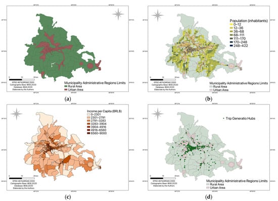 Characterisation of the study area. (a) Urban area; (b) Population; (c) Income; (d) Trip generation hubs.