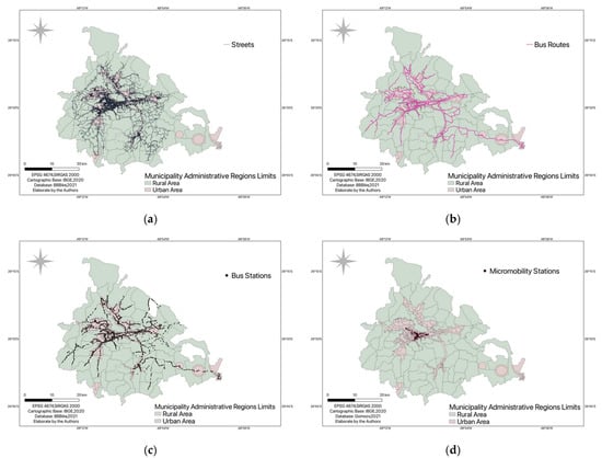 Characterisation of the transportation infrastructure. (a) Road infrastructure (streets); (b) Bus routes; (c) Bus stations; (d) Micromobility stations.
