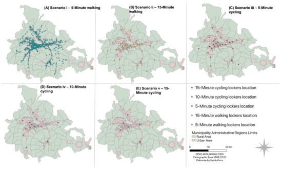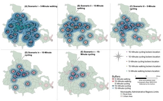 Additionally, for each scenario, the influence area of each locker was measured for different coverage ranges. This process was based on the 15-min city concept. Thus, given the number of lockers identified for each scenario, a coverage range was measured by buffer using distances in the network. The following situations were considered: 5-min walking, 15-min walking, 5-min cycling, 10-min cycling and 15-min walking. For each case, different metrics were calculated in the buffer, including population, public transportation and micromobility users.