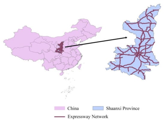 In 2021, there were 19 expressways in the PEN in Shaanxi Province, with a total mileage of 6484 km. Figure 1 depicts its geographical location overview.