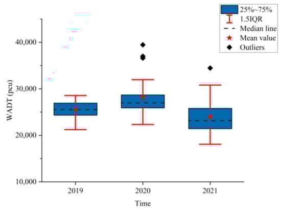 The analysis results in Figure 2 show that the box width and the distribution range of 1.5 IQR were the narrowest without outliers. This result indicates that before the COVID-19 outbreak, the distribution of traffic volume was relatively concentrated with low fluctuation. With more outliers, both the box width and 1.5 IQR range of the WADT boxplot in 2020 were larger than those in 2019, and the standard deviation was 4108 pcu, reaching the maximum within the three years. This finding indicates that in the first year of the COVID-19 outbreak, the fluctuation of traffic volume reached the maximum under the impact of pandemic. According to the analysis results, the mean value of WADT in 2020 was higher than that in 2019 and 2021. This is mainly because in the early stage of the outbreak in 2020, passenger and freight transportation at the social level in Shaanxi Province was greatly affected by the pandemic prevention and control policies in a period of time, and it was impossible to operate normally for relative enterprises. As the traffic restriction measures were gradually reduced and lifted, relevant enterprises were eager to resume production due to their interests, and the demand for passenger and freight transportation increased sharply in a short time, resulting in an appreciable increase in the WADT of PEN, which was higher than that in the same period before and after the outbreak. With the operation and production of enterprises gradually returning to normal levels, and subject to the government’s regulation, the traffic volume of expressways returned to a relatively stable state and was closer to that of previous years. The analysis results in Table 3 show that the growth rate of WADT standard deviations in 2020 and 2021 reached 96.27% and 87.24%, compared to that in 2019, respectively. This finding indicates that the dispersion and fluctuation of traffic volume distribution increased appreciably in the COVID-19 pandemic context.