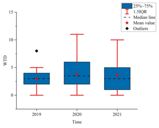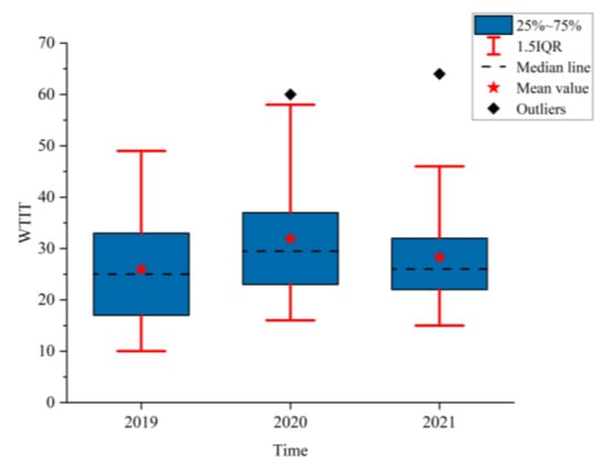 In 2021, the mean, median, and standard deviation of WTIT was 28, 26, and 10.58, with a decrease of 12.50%, 11.86%, and 12.56%, compared to that in 2020, respectively. However, they were still higher than the normal level in 2019 before the COVID-19 outbreak. Furthermore, the 1.5IQR distribution range of the WTIT boxplot in 2021 decreased compared to that in 2020. This finding indicates that the frequency of traffic interruption accidents and its fluctuation decreased with the gradual control of the pandemic.