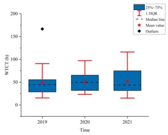 The analysis results in Figure 4 and Table 3 show that from 2019 to 2021, the WTCT mean values were 48.52, 50.62, and 51.48 h, respectively, with an increasing trend year by year. Meanwhile, the box width of the WTCT boxplot kept increasing within the three years. This result indicates that the traffic control time and its fluctuation kept increasing in the COVID-19 pandemic context.