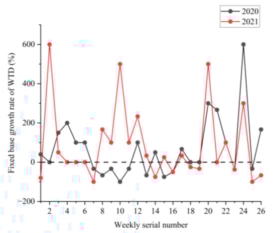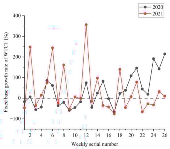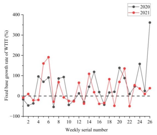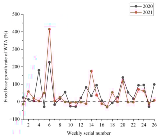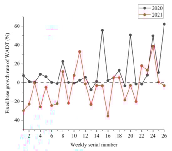 The analysis results in Table 4 show that, in 2020, the proportion of positive growth in the fixed base growth rate of WADT, WTIT, and WTCT was 76.92%, 69.23%, and 57.69%, respectively, all of which were higher than in 2021. This finding indicates that in the first year of the COVID-19 outbreak, the traffic volume, traffic interruptions, and traffic control time showed an increasing trend on the whole. In 2021, the proportion of positive growth of WADT, WTIT, and WTCT decreased by 42.3%, 15.38%, and 7.69%, compared to that in 2020, respectively. This result indicates that the impact of the pandemic on the PEN service level parameters began to decrease with the gradual control of COVID-19, and the growth trend of the PEN service level parameters slowed down.