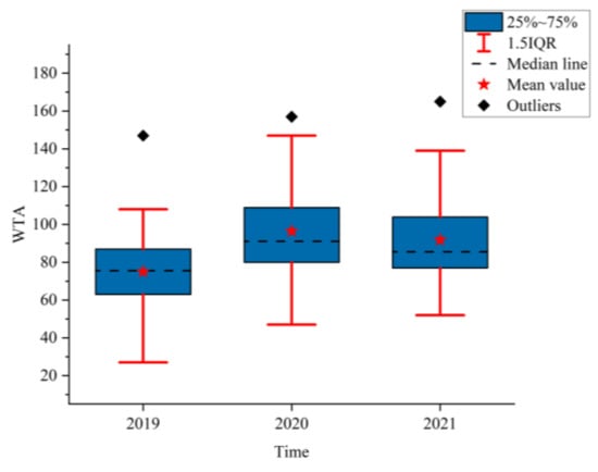 The analysis results in Figure 8 and Table 5 show that in 2020, the mean, median, and standard deviation of WTA was 96.42, 91, and 26.98, respectively, reaching the maximum within the three years. Meanwhile, their growth rate was 28.56%, 20.53%, and 19.01%, compared to that in 2019, respectively. The box width and 1.5IQR distribution range of the WTA boxplot were the largest in 2020. This finding indicates that in the first year of the COVID-19 outbreak, the number of traffic accidents, including their fluctuation, reached the maximum, and their distributions were relatively discrete.
