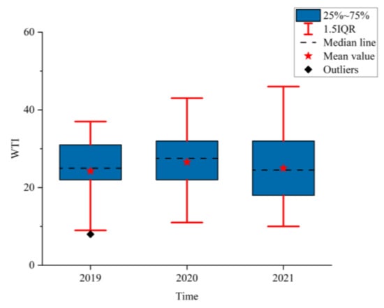The analysis results in Figure 9 and Table 5 show that in 2020, the mean and median of WTI was 26.58 and 27.50, respectively, reaching the maximum within the three years. Furthermore, their growth rate reached 9.70% and 10.00%, compared to that in 2019, respectively. The standard deviation of WTI was 7.52 in 2020, the minimum within the three years, with a decrease of 6.93% compared to that in 2019. This finding indicates that in the first year of the COVID-19 outbreak, the number of traffic injuries increased, with a decrease in fluctuation and an increase in distribution concentration.