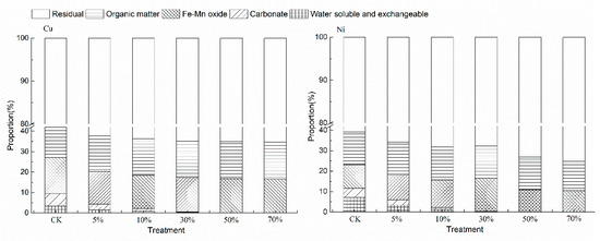 The residual was the main fraction of Ni and Cu, accounting for 53% and 57% of the total amount in the control group of soil, respectively, followed by that of bound to organic matter (20% and 16%), bound to Fe-Mn oxides (18% and 12%), bound to carbonates (6% and 7%) and exchangeable (3% and 4%) (Table 4 and Table 5). The content of each fraction was in the order: Residual > bound to organic matter > bound to Fe-Mn oxides > bound to carbonates > exchangeable.