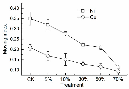 The mobility of heavy metals in soil is characterized by the mobility index (MI). As shown in Figure 2, the MI of Ni and Cu decreased with an increasing level of bentonite; it was reduced by 9% and 20% with 5% of bentonite addition, respectively, but decreased from 0.35 and 0.21 in CK to 0.11 and 0.09 in the treatment with 70% bentonite addition, i.e., decreases of 68% and 56%, respectively.