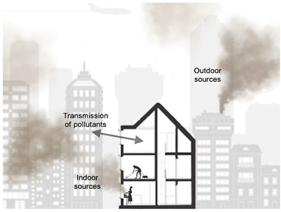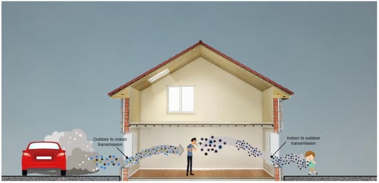 The global COVID-19 pandemic has brought about lockdowns in various places around the globe, causing steep reductions in economic activities and the significant curtailment of emissions. The importance of good air quality was re-emphasised when multiple studies accentuated the improvement in urban air quality due to the restricted anthropogenic activities in early 2020 [,,,,]. Observations by NASA [] indicated a significant drop in NO2 emissions over Wuhan during the early stages of the pandemic against the data from the preceding year. As more and more people opt to work from home [,,,], along with future low-carbon emission trends, where exhausts from automobiles and factories are reduced, buildings become more air tight to meet energy efficiency targets, etc., it is pertinent to know the changes in indoor air quality and its likely impact on health and wellbeing. Renewed interest in studying the indoor–outdoor air quality and the interface between the two has been rekindled due to this transformation of indoor space usage []. Figure 1 shows how the two domains are variably connected, and how pollutants from either source can affect the air quality as air exchanges occur between them.