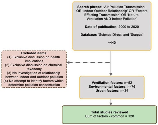 This paper systematically reviewed the measured and modelled studies of pollutant transmission and relationships between indoor and outdoor environments. A better understanding of the transmission and infiltration characteristics of naturally ventilated buildings is necessary to allow for the design of healthy indoor spaces. Further, the urban context and meteorological parameters can influence the mechanism of pollution transmission. Despite the increasing studies on indoor pollution, the mechanism of the transmission of ambient pollutants is not clearly understood for naturally ventilated buildings due to a number of confounding factors. This review, thus, sought to address the gap in the literature pertaining to the review of the determinants of transmission and interaction between the two domains. The search criteria and methodology of investigation is shown in Figure 2. An extensive literature search was performed to identify publications on existing studies. Peer-reviewed journals, conference papers, technical reports and books from the last decade (with some exceptions) were searched using the Scopus and ScienceDirect search engines. The search was carried out using keywords such as “air pollution transmission”, “indoor outdoor relationship”, “factors affecting transmission” and “natural ventilation and indoor pollution”. Following a data collection process of identification, screening, eligibility analysis and inclusion, we selected and reviewed 120 articles (from an initial list of 440 articles). The study was limited to the review of factors or parameters linked to the increased severity of indoor air pollution and transmission, while discussions on mitigation and intervention strategies were considered beyond the scope.