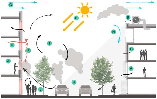 Urban features, such as deep street canyons, massive building footprints, inadequate open spaces, etc., can amplify outdoor pollution levels by hindering dispersion [,]. Even street elements, such as trees, can prevent the dispersion of pollutants in certain wind conditions [] (see factors H–K in Figure 3 and Figure 12).