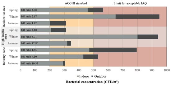 Apart from particulate matter, bacterial composition in indoor air also impacts the quality and wellbeing of occupants. To this end, Harbizadeh et al. [] measured bacterial and particulate matter concentrations in six day-care centres in the city of Ahzad, Iran. Among the three site conditions, the highest I/O ratio for bacterial and PM concentration was found for the buildings located in the high-traffic region (see Figure 4). Further, the highest pollutant levels were observed during the cold month of February, which the authors attributed to dust storms. They observed a positive correlation between airborne bacteria and particulate matter, and concluded that the use of open windows for natural ventilation was the main cause of transmission. Although the small number of samples and sampling period used in the study prevents the generalisation of results, the authors point to the fact that despite a lower bacterial I/O ratio in winters, the absolute concentration of aerial bacteria was worst in winter amongst all other seasons. Thus, the measurement of only the I/O ratio may not reveal finer details of air quality, and pollution studies should attempt to measure the absolute pollutant levels as well. This can be observed in Figure 5, where the I/O ratio of 4.38 had a higher absolute concentration of bacteria than the I/O ratio of 19.33.