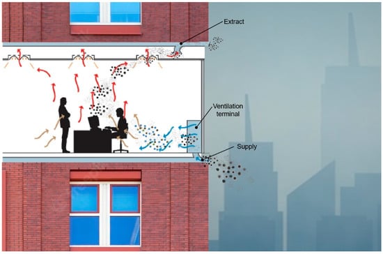 In this mode of ventilation, the air is supplied, regulated and conditioned with a mechanical system such as a ventilation fan or an air conditioner or by a central conditioning system []. In some cases, mechanically ventilated buildings have no operable windows or cannot be operated by occupants, and all the fresh air is directed through installed systems []. In such cases, the location of the intake vent, the filtration and air treatment efficiency of the HVAC systems, the location of ducts, etc., determine the transmission of pollutants. This is shown in Figure 6. Most commercial building stock in developed countries uses mechanical ventilation, necessitating the need to understand the mechanism of air filtration in these systems.