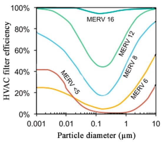 Thus, the improvement of air quality with MV requires a detailed analysis of operation times, filter type and their location, indoor source/sinks, etc. Figure 7 shows the efficiency of HVAC filter types for various particle size ranges. Most studies were limited in space and time, and generalised the results based on a small period of measurement. Very few studies actually investigated the transformation mechanism of pollutants when transported indoors. The mechanism was shown to modify the I/O ratio []. While the effectiveness of particular systems is well researched, including a comparative analysis of operation modes, the transmission mechanisms are still understudied. Future studies should investigate this in detail to help understand how various environmental factors may influence the choice of operation.