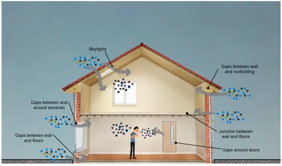 Pollutants can also enter buildings through envelope cracks, gaps around fenestrations and other building faults (see Figure 8), apart from the above-listed modes, which are not intentionally designed for this. Factors such as the air exchange rate, pressure gradient across the building fabric, size of the particle and crack geometry strongly determine the penetration of particles [,] and can be significant for buildings with poor sealing []. A study by de Blas et al. [] showed that I/O ratios inside a test room, which was sealed with no windows or fresh air supply, had an I/O ratio close to one for outdoor source pollutants, whereas the pollutants which were known to be produced within the same building showed a ratio greater than one. The study, however, did not conduct a detailed transformation and accumulation analysis of the pollutants.