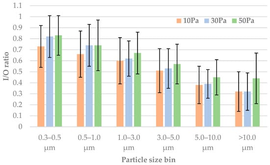 Additionally, building elements such as stairwells, elevator shafts, electrical conduits, etc., may also serve as pathways for air infiltration, especially in commercial buildings []. To this effect, Choi and Kang [] studied the effect of envelope airtightness on the penetration of particles in 14 residential flats in Korea (Figure 9). They observed that the I/O ratio of finer particles was consistently higher for all air tightness conditions. Additionally, the I/O ratio decreased within each size bin with an increasing air change rate. A positive relation was found between effective leakage areas (ELAs), which quantified the equivalent number of holes in the envelope, and the penetration of particles, although the results were not statistically significant. They concluded that even moderately airtight apartments in the region were susceptible to outdoor infiltration, and as the buildings grew taller, and were exposed to higher pressure differences, the penetration was significant. The units chosen were, however, naturally ventilated with a range hood in the kitchen and an exhaust fan.