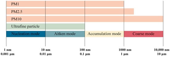 Wind direction and speed are known to alter the indoor air quality regime, specifically high wind speeds and pressure differences that promote air exchanges, consequently leading to the transportation of particles into buildings [] (see factor G in Figure 3). Although, in some cases, if the indoor sources are strong, higher wind speeds can be desirable to remove the pollutants []. A two-year-long measurement study of a classroom by Chithra et al. [] found that the effect of wind was dependent on regional pollution sources. They found a significant positive correlation between wind speed and indoor PM concentration when the wind was blowing from the direction of a major road. Consequently, no such observation was determined when the direction was from elsewhere. In general, I/O ratios of PM2.5 and PM1 decreased with increasing speeds. Additionally, in hot and dry conditions, strong winds may increase outdoor PM concentration through resuspension []. On the contrary, [] found that wind speeds greater than 1 m/s improved the air quality of a naturally ventilated room by increasing the air exchange rate. On the other hand Orza et al. [] showed an inverse relation between wind speed and particle concentration for particles smaller than 0.8 μm and a positive relation for particles larger than 7.5 μm. Similarly, the study by Lang et al. [] indicated that wind speed had a positive correlation with the PNC of particles in Aitken and the accumulation mode, and a negative correlation with the nucleation mode. Figure 11 shows the size ranges of the various pollutant particles.