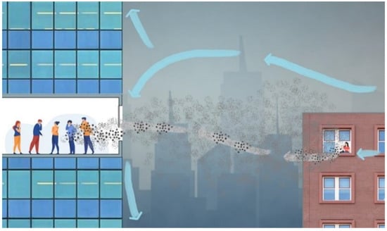 Recent studies have shown that a pollutant generated inside a room can be transferred to other nearby indoor environments []. Many pollutants are common to both indoor and outdoor sources. Additionally, these pollutants may also penetrate into or outside the building, depending on the buildings and their surrounding conditions. The three primary modes of the transmission of pollutants between the two zones are natural ventilation, mechanical ventilation and infiltration [,]. Additionally, indoor–outdoor parameters further influence the transmission, such as outdoor weather condition, temperature difference between the two environments, surrounding urban landscape, indoor activity, furnishing, etc. A typical cross-section of a building next to a street is shown in Figure 3, along with various factors affecting the transmission of pollutants.