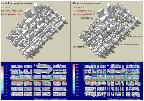 A review by Ai and Mak [] indicated that when street canyons are deep, the winds in the canyon and above the canyon become decoupled at lower speeds. This potentially leads to local airflow in street canyons when ambient wind is perpendicular to the street. This can concentrate pollutants on the leeward side of the building, significantly deteriorating the air quality there. Yuan [] simulated eight different urban geometry forms using CFD. Their results showed that strategies such as the higher permeability of urban forms, building separation, stepped podiums, etc., facilitated the convection of air, thereby dispersing pollutants (Figure 13).